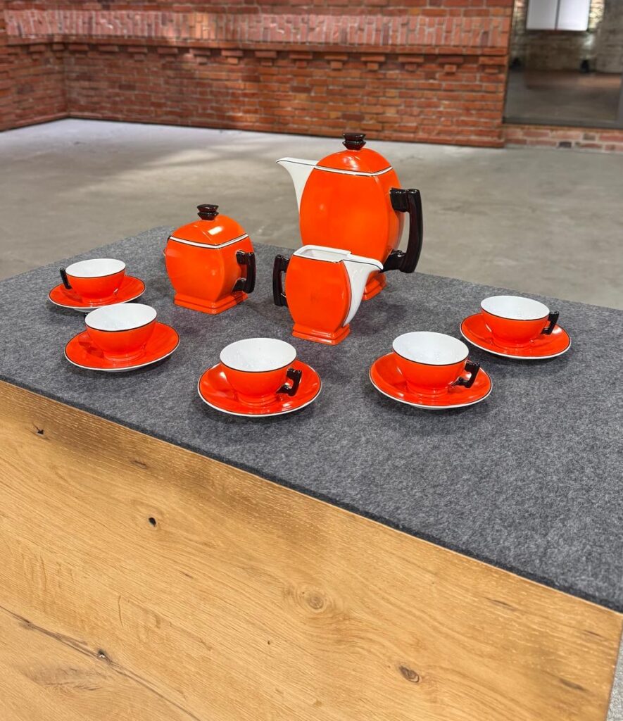 Was für ein Hingucker! Am 10.10.2025 leuchtete dieses Service bei „Bares für Rares“ förmlich. Dieses Kaffeeservice von Cmielów ist ein echtes Statement. Es strahlt in einem kräftigen Orange, fast wie ein Sonnenuntergang über Polen. Der Entwurf stammt direkt aus der Bauhaus-Zeit, um 1930. Wir vermuten den Designer Bohdan Wendorff dahinter. In Produktion ging es zwischen